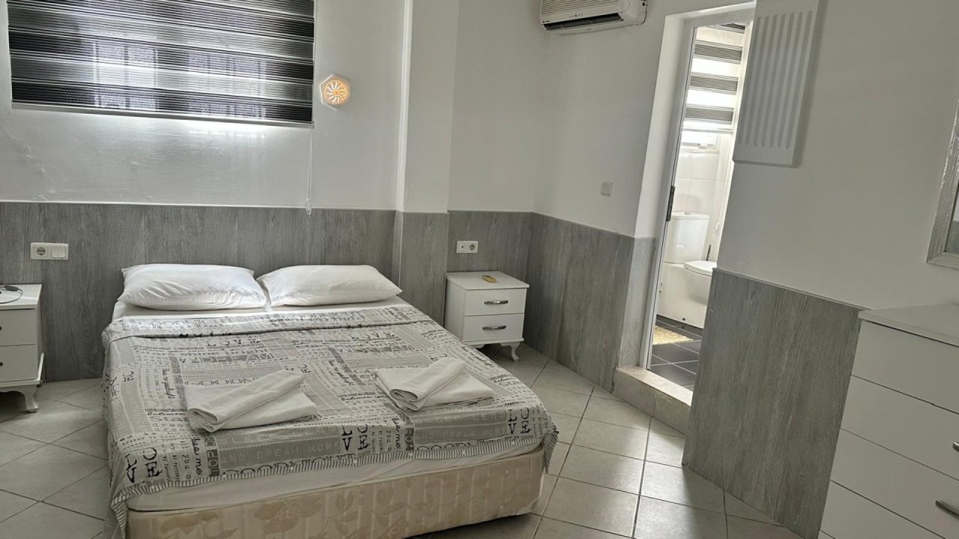 Çift kişilik yatak, klima, ebeveyn banyosu, elbise dolabı ve komodin -
