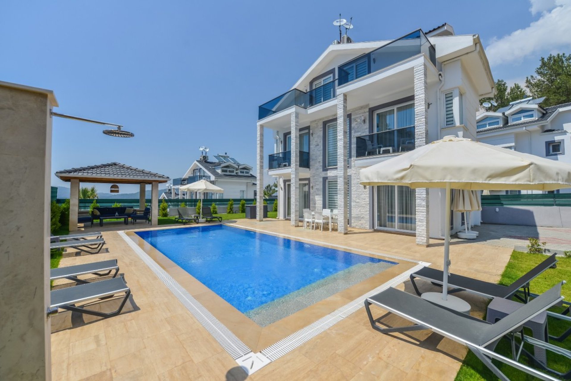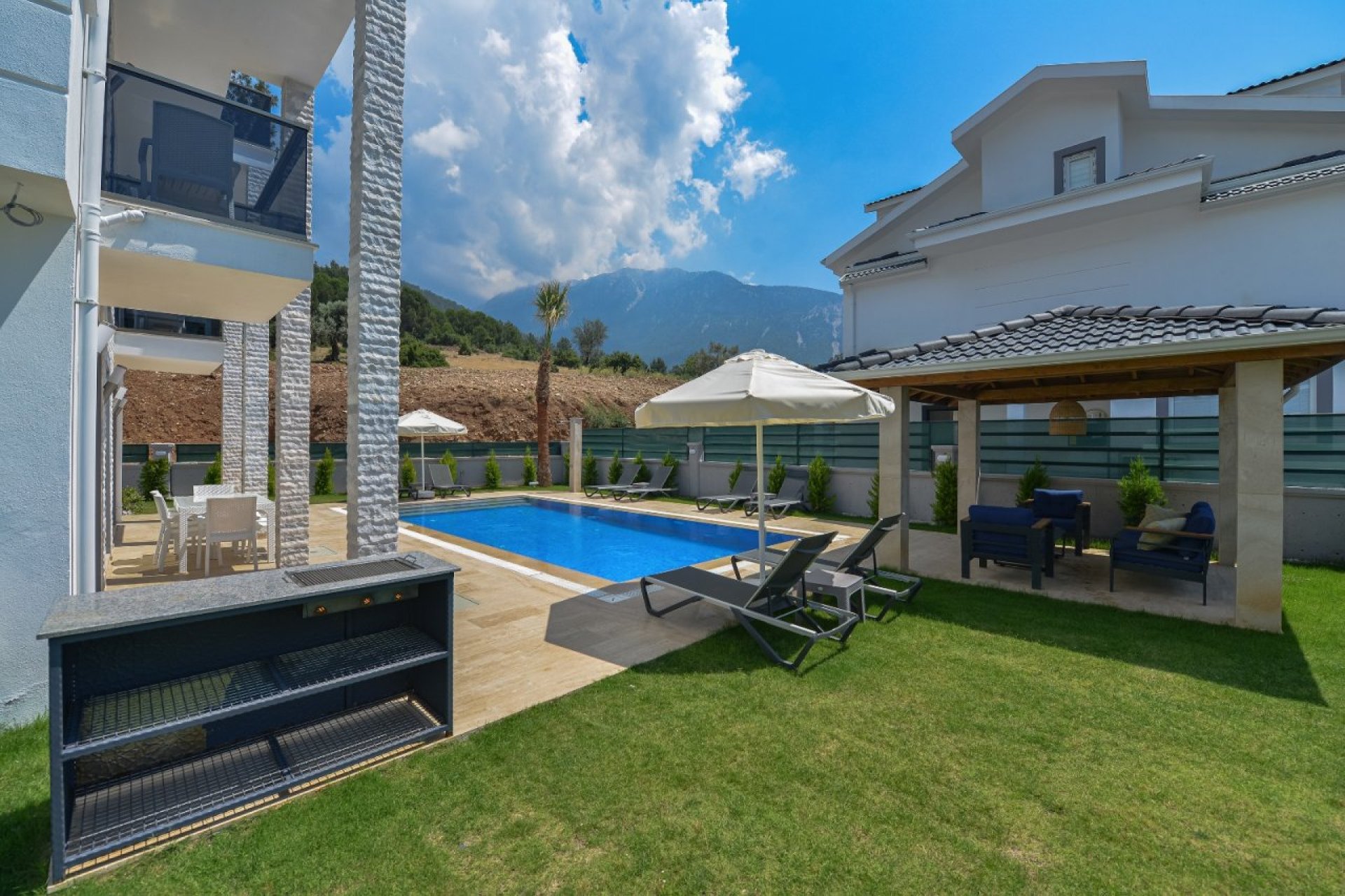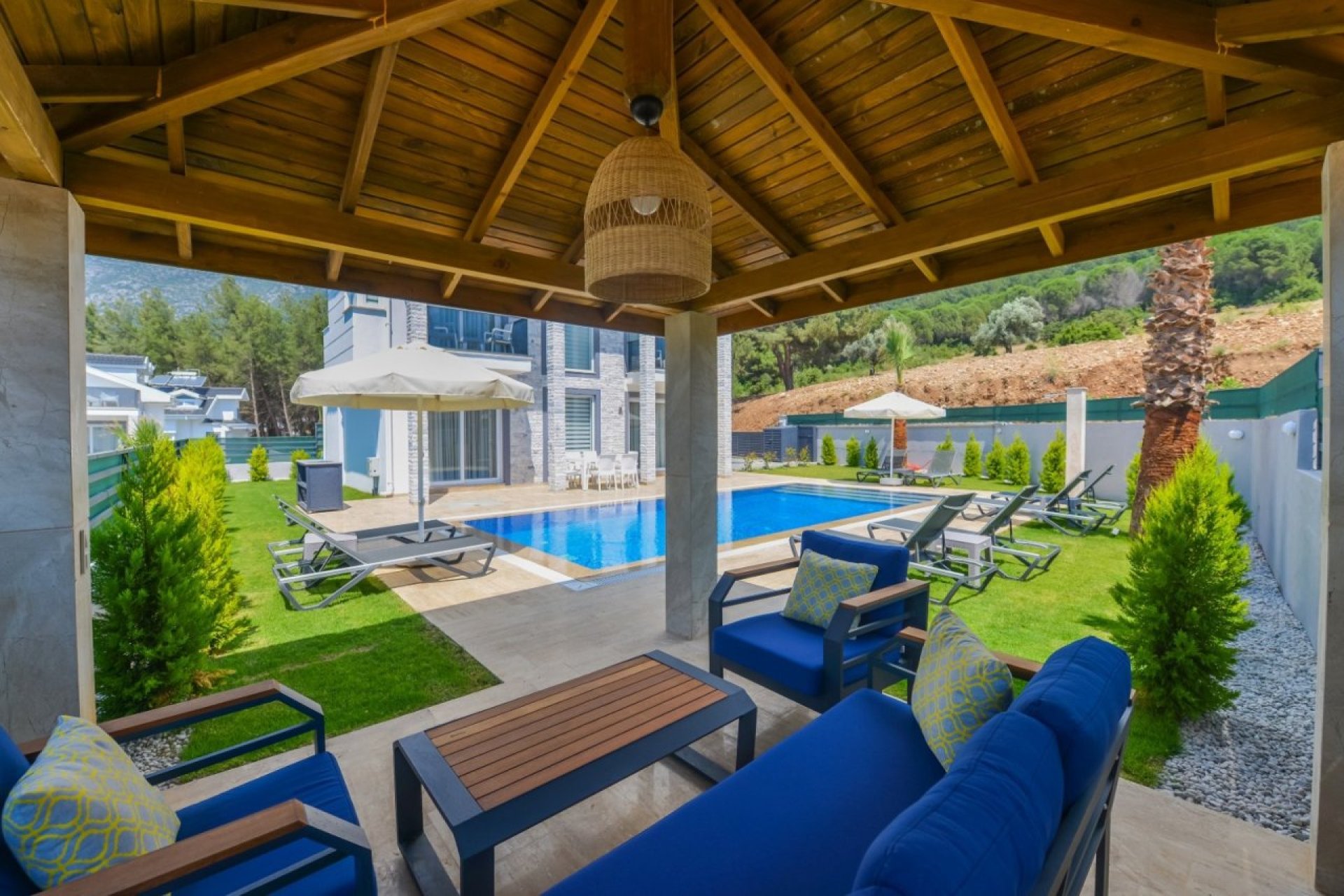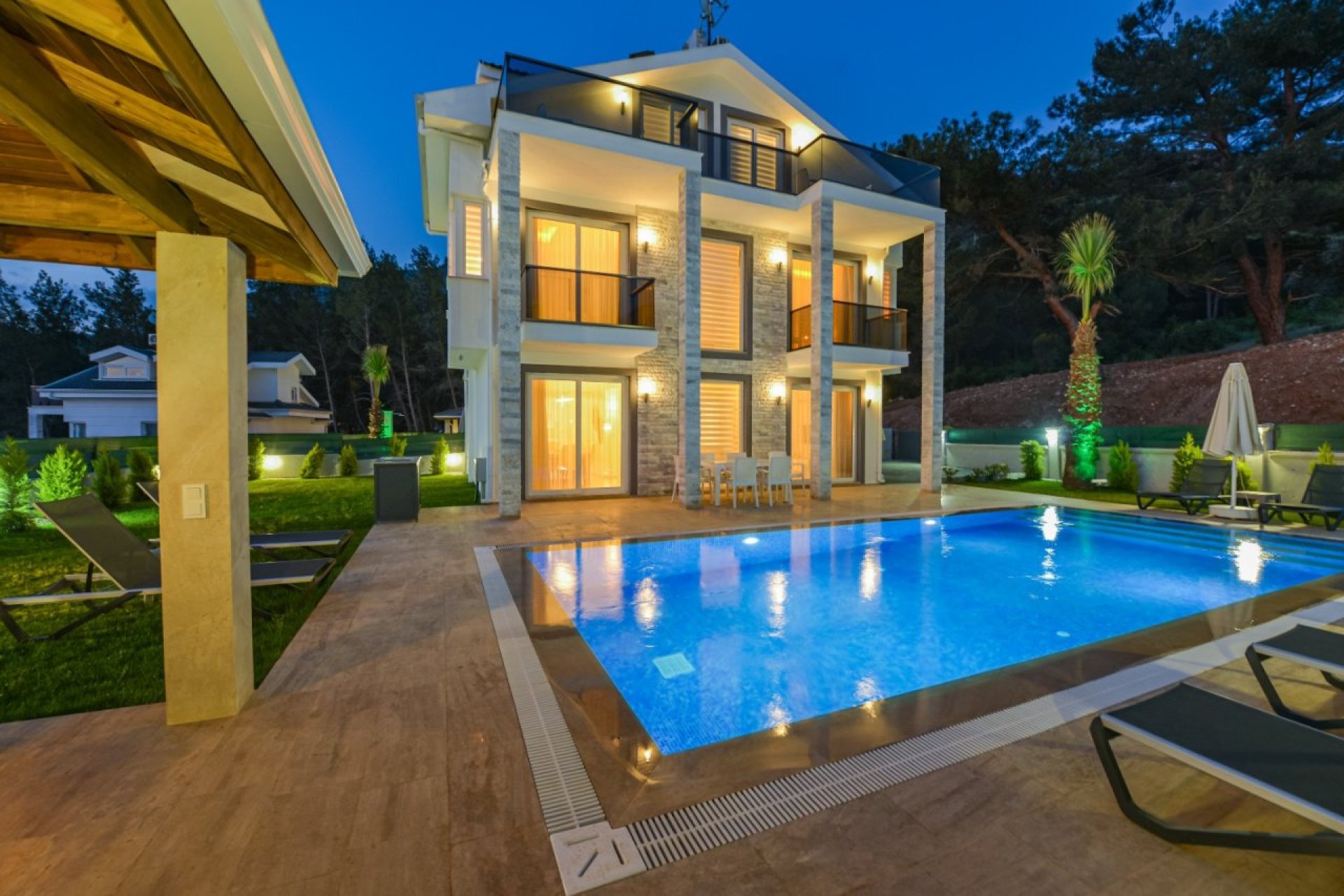 Villa Uçar A, Fethiye’nin en popüler tatil noktası Ölüdeniz’de, doğa manzarasıyla çevrili sakin konumda yer alan modern tasarımlı, özel havuzlu ve lüks bir tatil villasıdır.