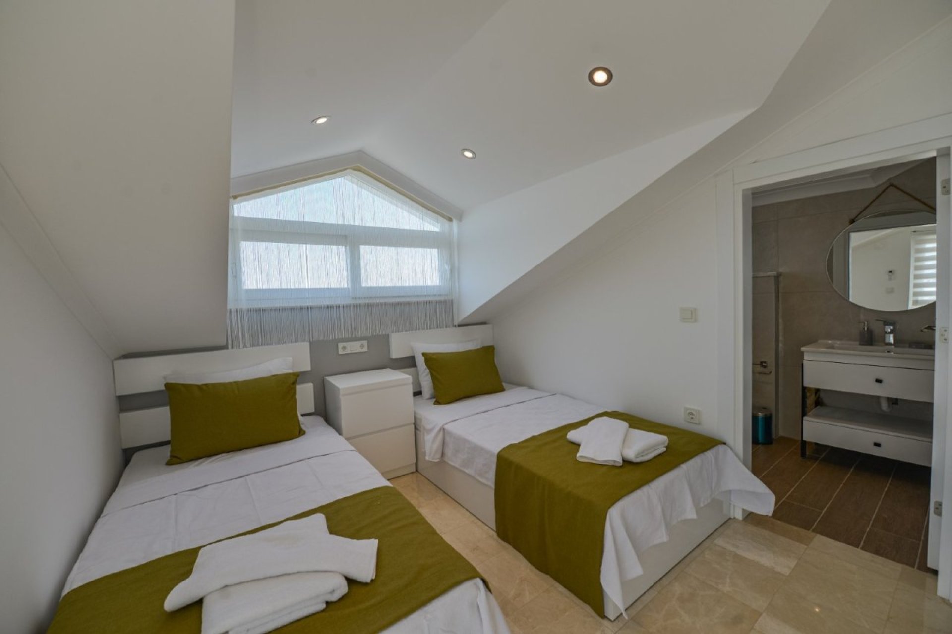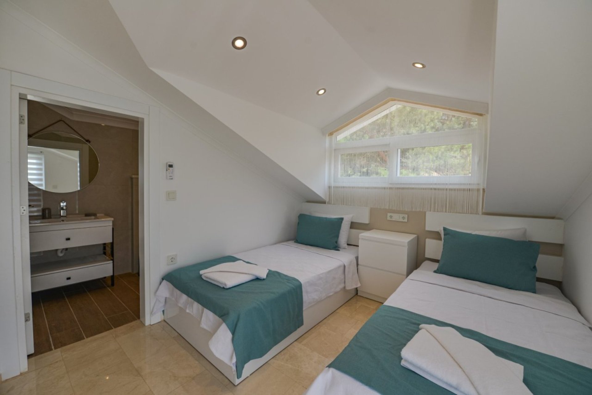 Toplam 4 yatak odası ve 4 banyo bulunan villamız, aileler ve arkadaş grupları için konforlu ve huzurlu bir konaklama sunar. Zemin katta ayrıca salona ait ortak WC bulunmaktadır.
